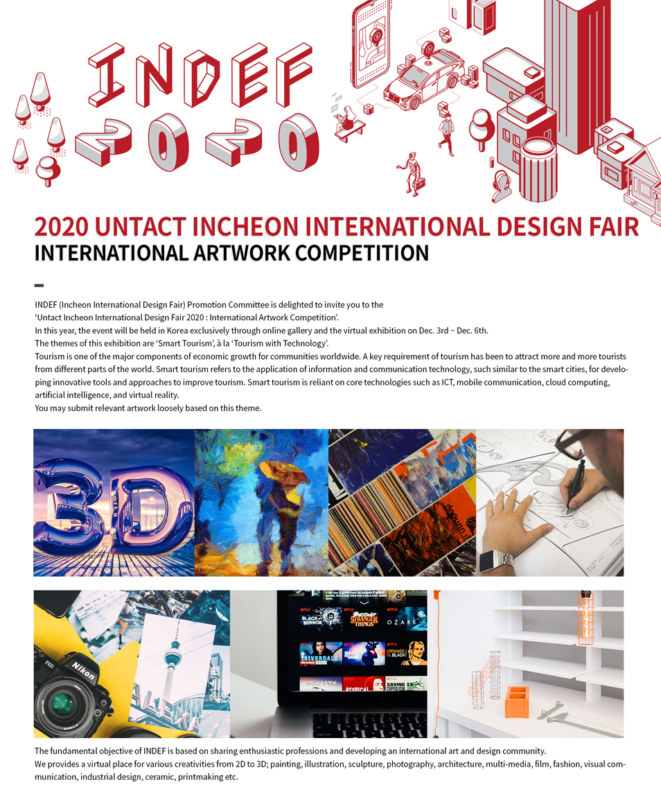 به گزارش روابط عمومی مرکز تجسمی حوزه هنری به نقل از indew.kr کمیته تبلیغات INDEF (نمایشگاه بین المللی طراحی اینچئون) از همه هنرمندان مشتاق و افراد خلاق در سراسر جهان به مسابقات بین المللی آثار هنری INDEF 2020 دعوت می کند.