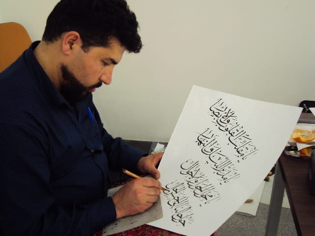 به سراغش میرویم تا رمز و راز دلبستگیاش به قلم و قلمدان و قلمتراش را برملا سازیم؛ او در همان ابتدا کلامش را با آرزوی نوجوانیاش پیوند میدهد و میگوید: کتیبه نگاری ۸۰۰ محراب مسجد را از سال ۷۰ با اجرای کاشی ساز، نقاش و مینیاتوریست توانای همدانی استاد حاج حسن قربانی در کارنامه دارم این یعنی همان آرزوی دوره نوجوانیام که به مدد خداوند محقق شده است.