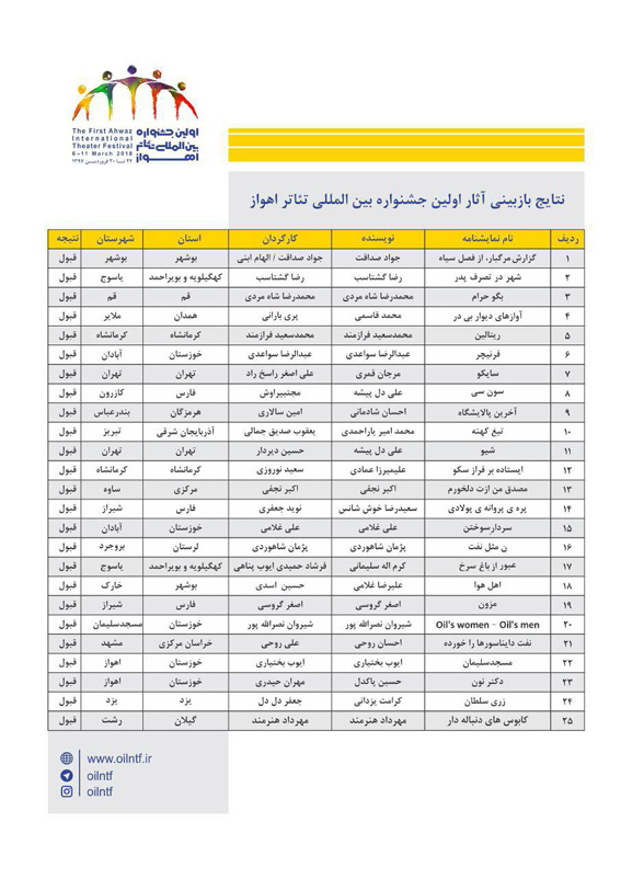 حشمت اله قاسمی، سیدصادق فاضلی و افشین القاسی، بازبینان اولین جشنواره بین‌المللی تئاتر اهواز، ۲۵ اثر نمایشی را برای حضور در این رویداد فرهنگی معرفی کردند.