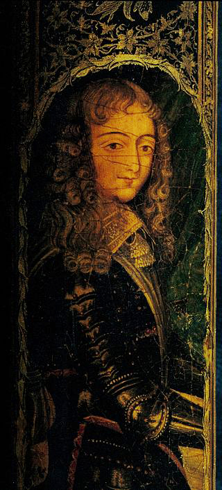 شاه سلیمان و درباریانش در اصفهان /۱۶۷۰ میلادی/ دو فرد گرجی در گوشه سمت چپ بالای تصویر و نامهایشان به زبان و الفبای گرجی/ اثر علی قلی جبهدار از مؤسسهٔ شرقشناسی سن پترزبورگ
