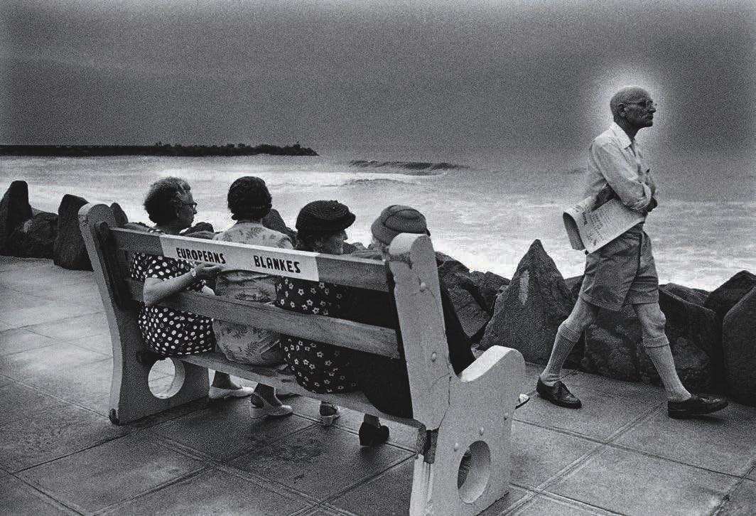 هنگامی که "السکن" در دوربانِ آفریقای جنوبی بود، این صحنه ی گویا را در یک گردشگاهِ کناردریا به تصویر کشید.  چهار زنِ سالخورده، غرق در گفتگو بر نیمکت سیمانی روباز نشسته اند و مردی در سکوت، زیر آسمانِ تیره و طوفانی می گذرد. شاید اطراف سر مرد، توسط "السکن" و در تاریک خانه روشن تر شده، تا در برابر زمینه ی لکه دار و خشن تصویر، برجسته به نظر بیاید. کلمات حک شده بر پشت نیمکت (نیمکت اروپایی ها)، به عکس مفهوم سیاسی داده است، چون زنان را به عنوان نماینده ی نظام آپارتاید (تبعیض نژادی)، و بهره بردارانِ تفکیک نژادی معرفی می کند.